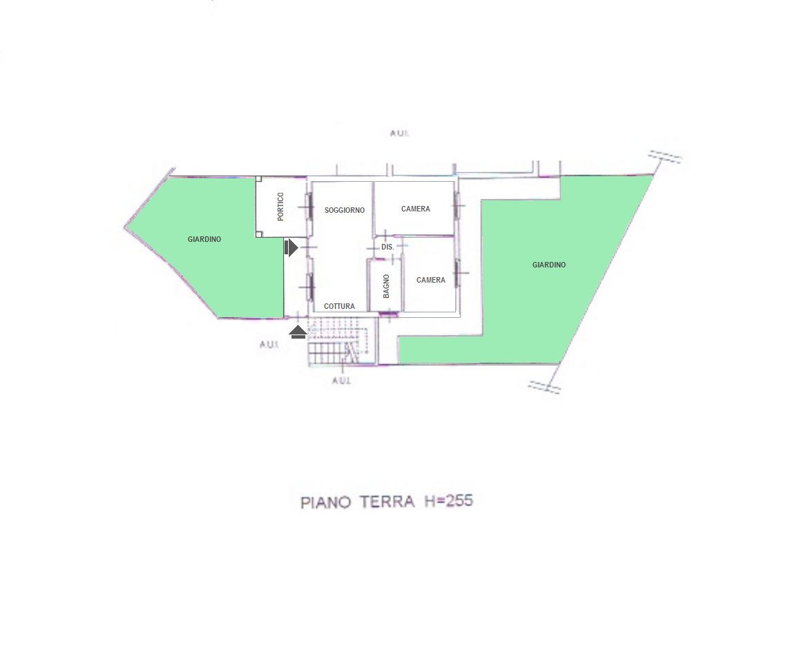 L'appartamento presenta un ingresso autonono dal suo giardino e si compone di soggiorno con cucina a vista, disimpegno con due camere e bagno.